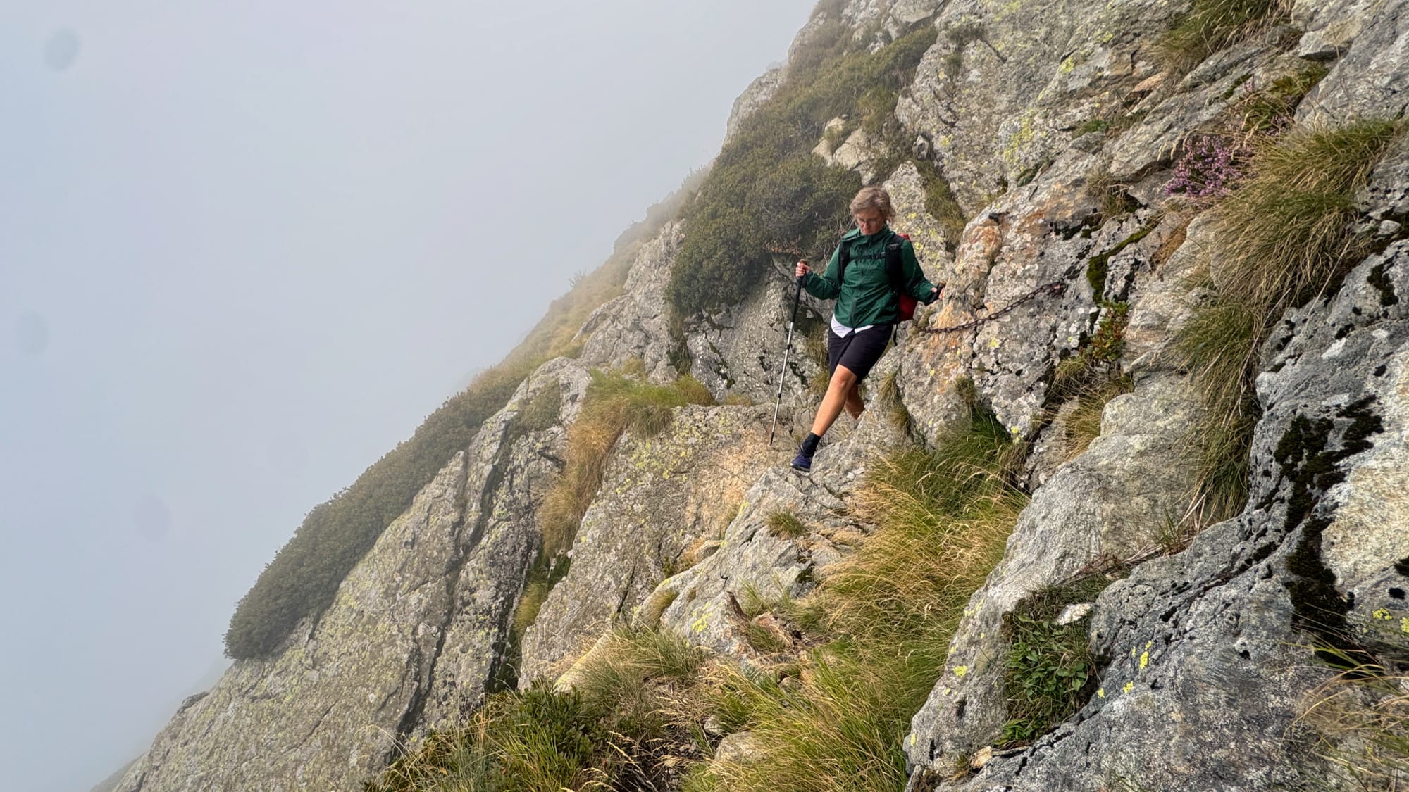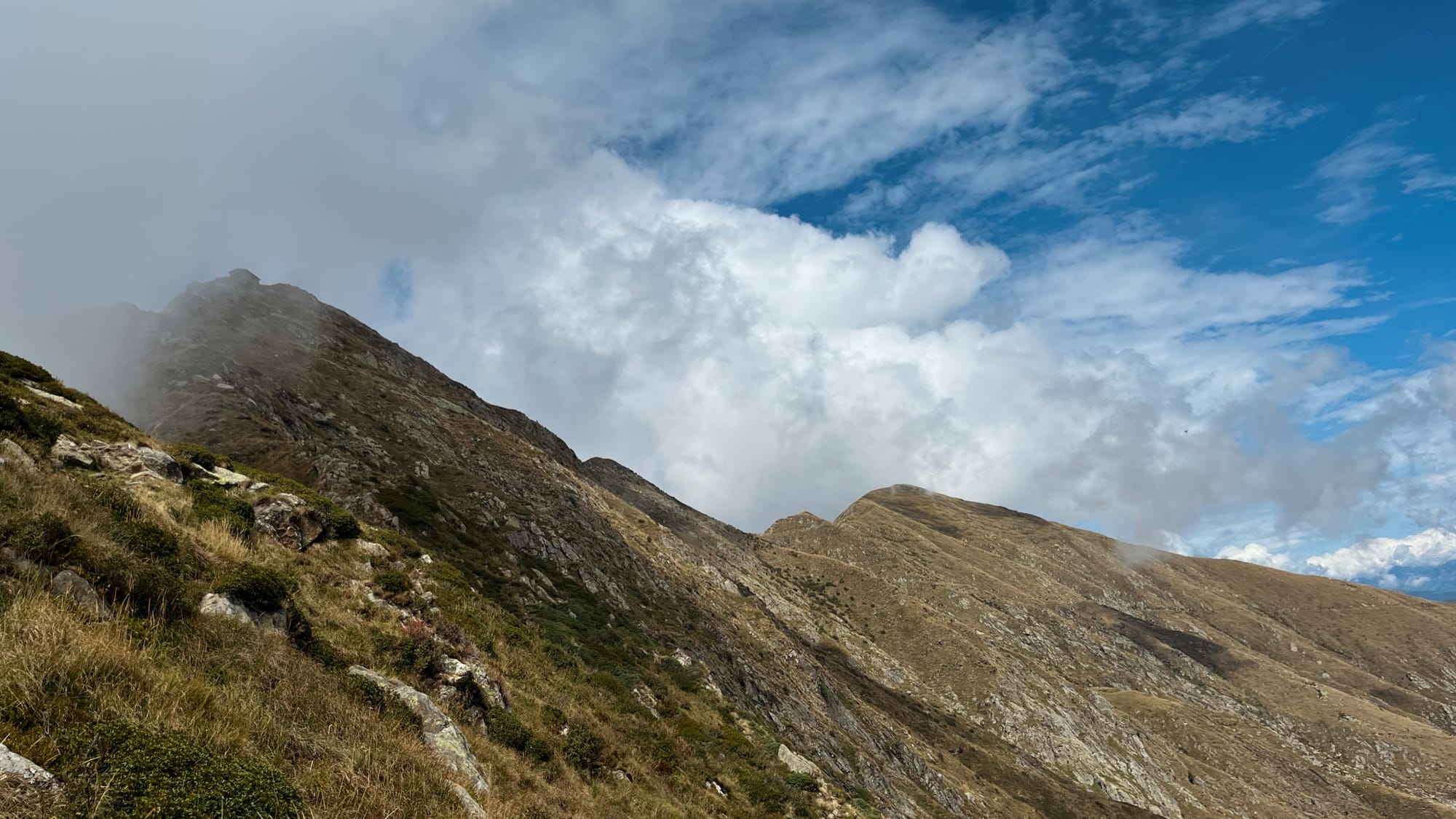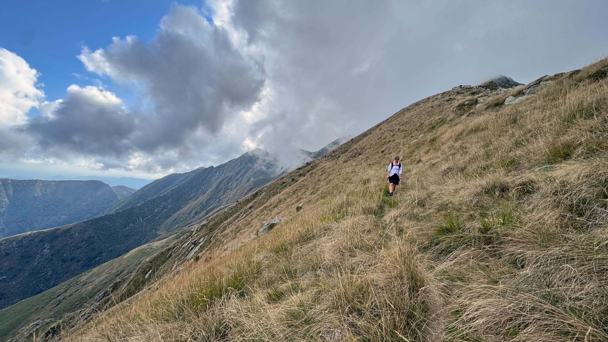 Mit grandioser Fernsicht brechen wir ausgeruht auf. Nach einem kurzen Kaffeestopp am schön gelegenen Rifugio Pian Cavallone sind wir schon mitten im spannenden Routenverlauf über den Grat und an wohlklingenden Namen wie "Passo del Diavolo" und "Pizzo Marona" vorbei. Der Weg ist nicht ganz ungefährlich, die Tritte müssen schon sitzen und Hände stabilisieren, aber er ist gut zu gehen.