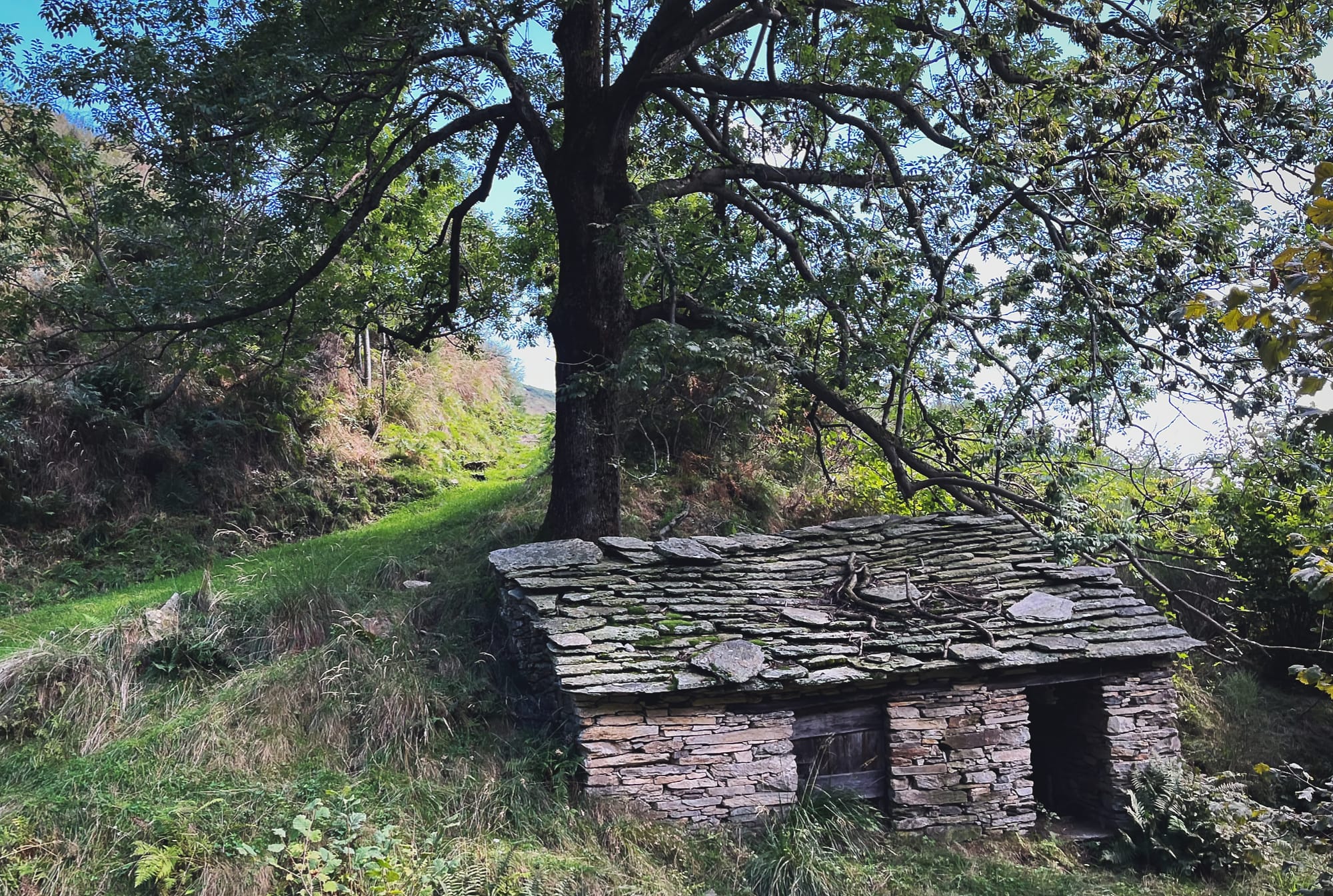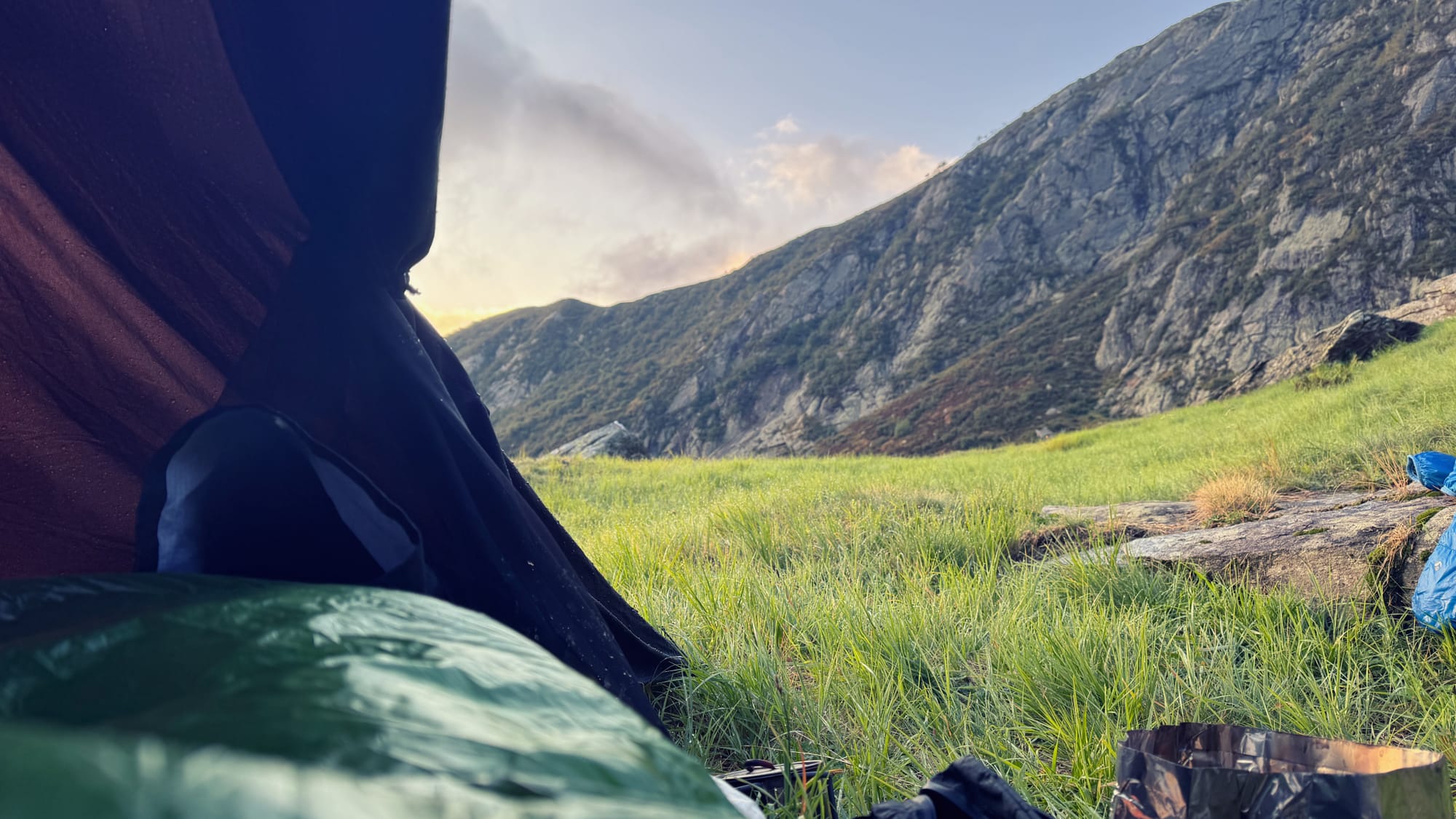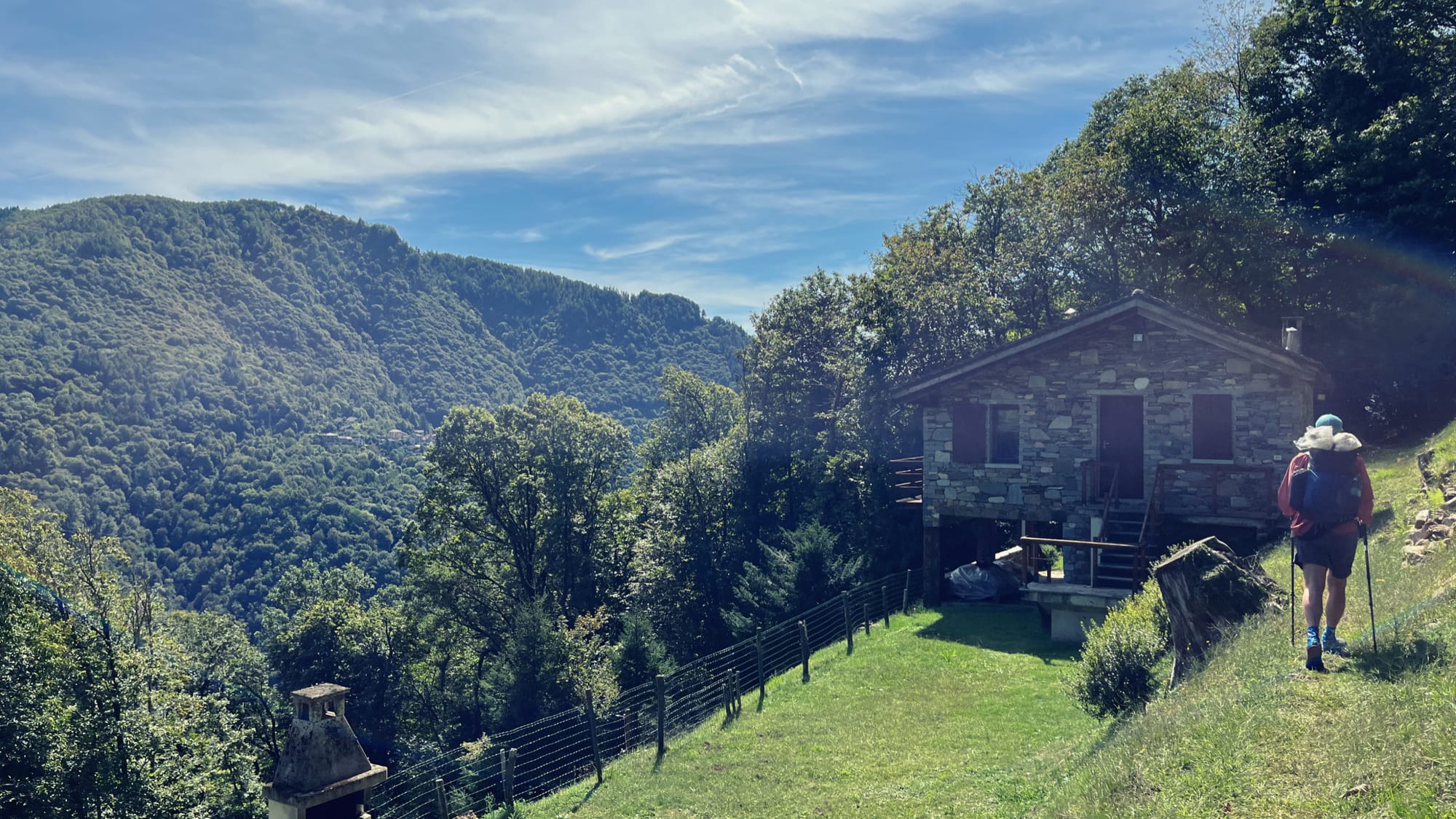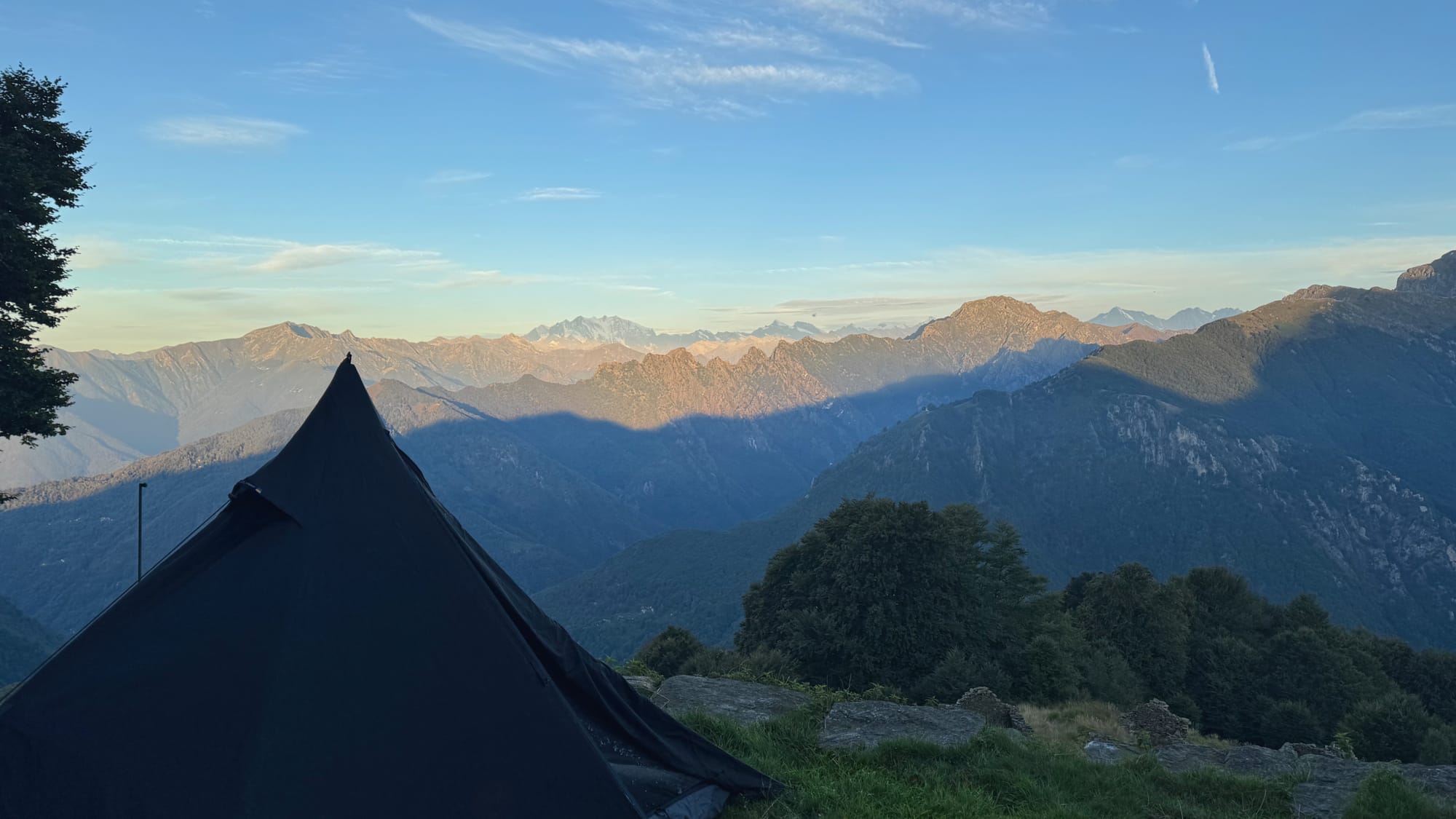 Wir sind nachmittags in Cicogna los, runter zum Fluss und dann knappe 1000 Meter Buchenhein in steilem Aufstieg hoch. Abends ist die Alpe Curgei dann erreicht, nach einem kurzen Plausch mit den beiden Menschen, die sich in der gemütlichen Hütte ausgebreitet haben, schlagen wir etwas oberhalb unser Zelt auf.